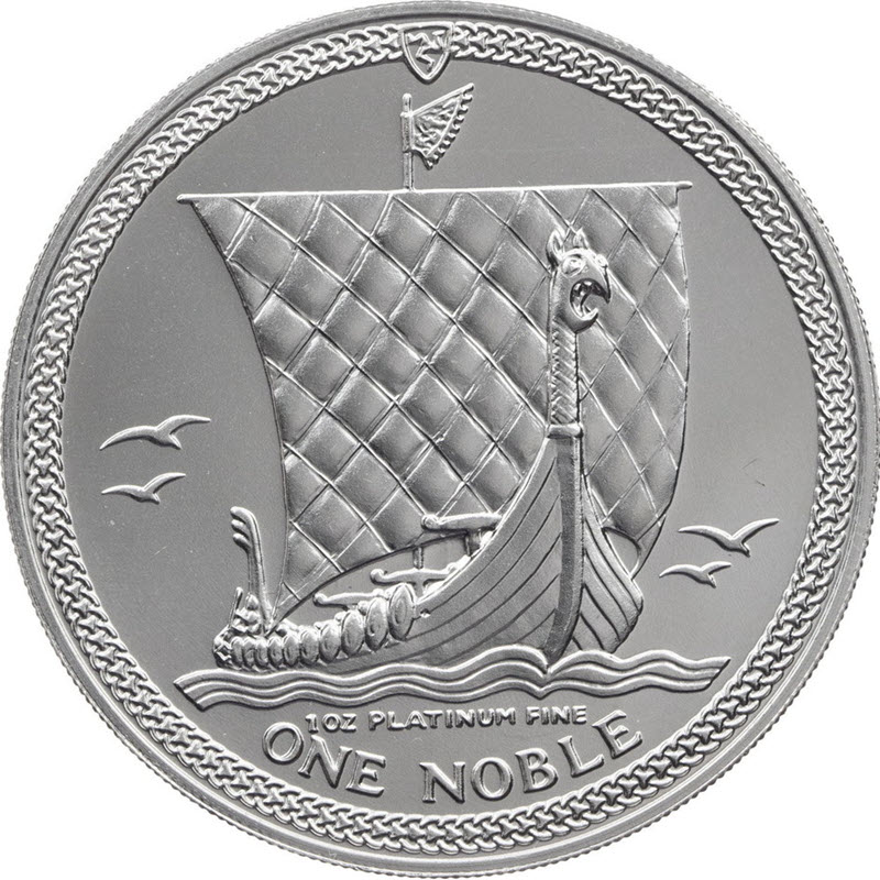 На реверсе изображен легендарный длинный корабль викингов, прорезающий волны на полных парусах. Внизу надпись в две строки: 1 OZ PLATINUM FINE ONE NOBLE (1 унция чистой платины, номинал).
