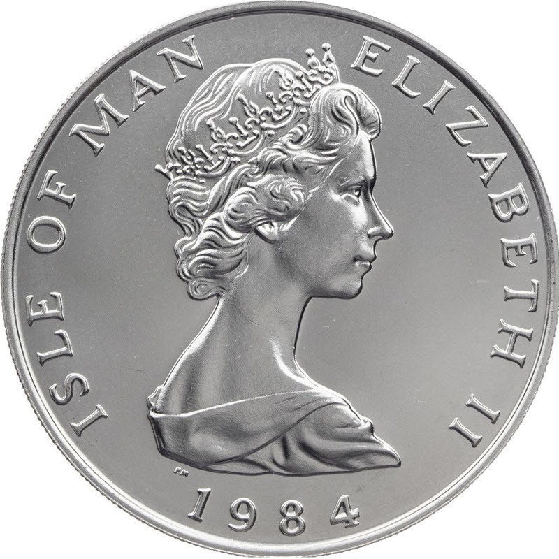 На аверсе изображен портрет королевы Елизаветы II работы дизайнера Арнольда Мачины (Arnold Machin). Под изображением королевы монограмма монетного двора PM (Pobjoy Mint). Вдоль канта надписи: ISLE OF MAN ELIZABETH II 1984 (страна-эмитент, Елизавета II, год чеканки).