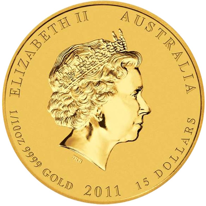 Золотая монета Австралии Лунар II "Год Кролика" весом в 1/10 унции.