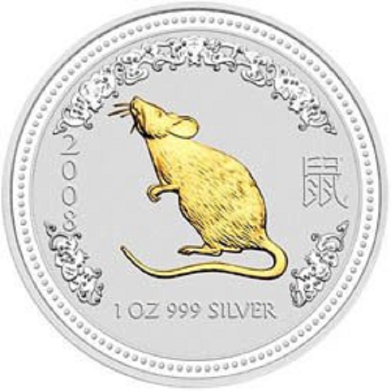 Серебряная монета Австралии "Год Крысы" 2007 г.в.(с позолотой), 31.1 г чистого серебра (Проба 0,999)