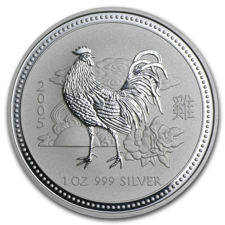 Австралийская серебряная монета из первой серии "Лунный календарь", выпущенная в 2005 году - году Петуха.
