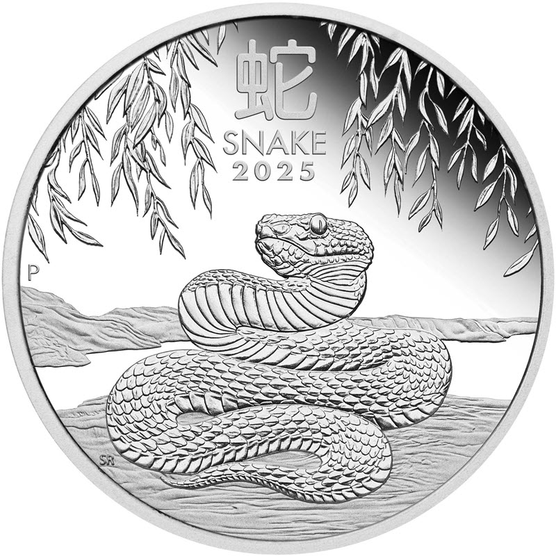 На реверсе изображена свернувшаяся змея на берегу реки под свисающими листьями. Слева монограмма Пертского монетного двора Р. Слева внизу инициалы дизайнера: SR (Sean Rogers). Вверху надпись: 蛇 SNAKE 2025.