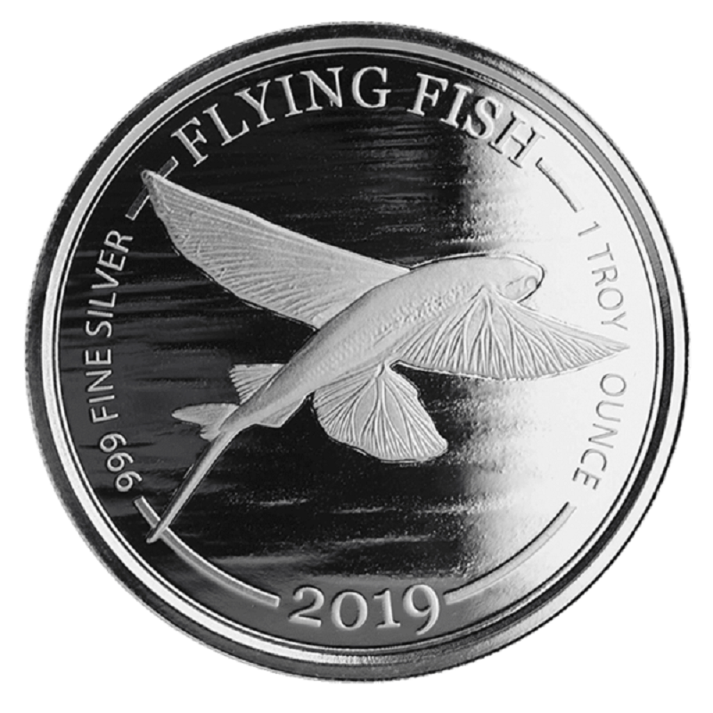 На реверсе изображена летучая рыба. По окружности расположена легенда: название вида рыбы – «FLYING FISH», характеристики металла – «999 FINE SILVER», «1 TROY OUNCE».