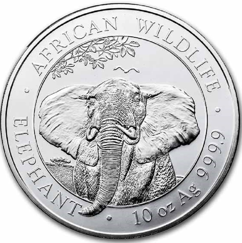 Серебряная монета из серии «Африканская дикая природа» с изображением культового слона, весом 10 тройских унций.