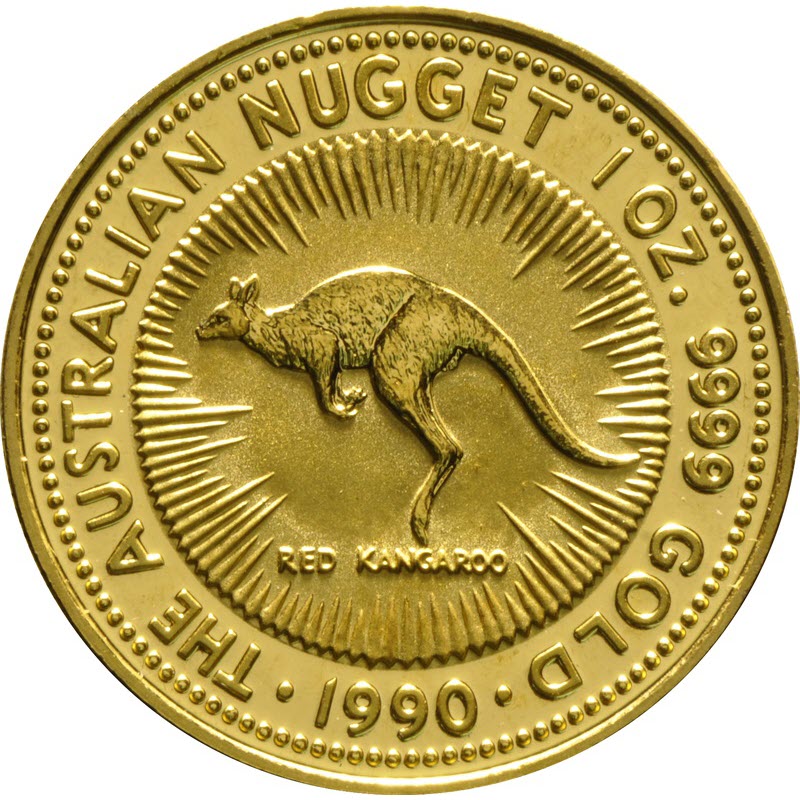 На реверсе изображен прыгающий кенгуру. Под ним надпись: RED KANGAROO. Вдоль канта надпись: · THE AUSTRALIAN NUGGET 1 OZ. 9999 GOLD · 1990 · (австралийский кенгуру, вес и проба золота, год чеканки).