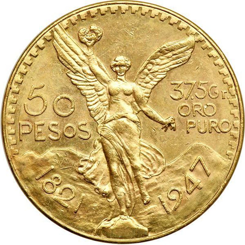 На реверсе изображен ангел свободы, держащий в поднятой правой руке венок. Слева от ангела надпись ""50 PESOS"", а справа "37.5 Gr. ORO PURO" - 37,5 грамма чистого золота. Ниже две даты: слева "1821", справа "1947". Надпись "1821" на аверсе монеты - это дата подписания Кордовского договора в 1821 году, после восстания во главе с католическим священником Мигелем Идальго.