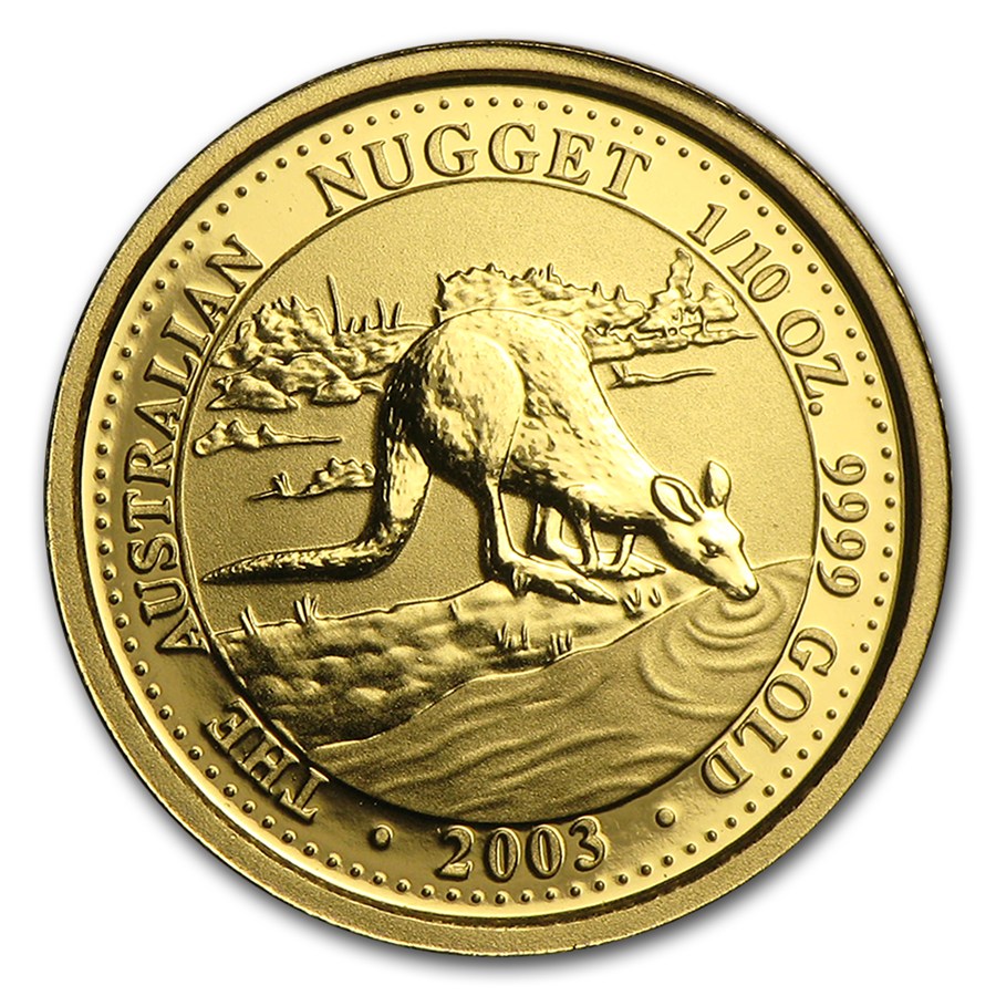 На реверсе представлен кенгуру — символ Австралии. Изображение меняется каждый год. Надпись "AUSTRALIAN NUGGET" — австралийский самородок. Также указаны год выпуска монеты - 2003, вес - 1/10 oz. и проба золота - 0.9999. На данной монете изображен кенгуру, пьющий воду у ручья.