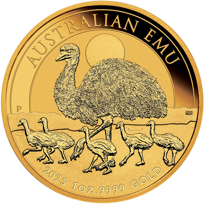 На реверсе изображен взрослый эму, идущий с пятью птенцами. Слева у канта Р (монограмма Пертского монетного двора), справа инициалы дизайнера NH (Neil Hollis). Вверху вдоль канта надпись: AUSTRALIAN EMU, внизу: 2025 1oz 9999 GOLD (год чеканки, вес и проба золота).