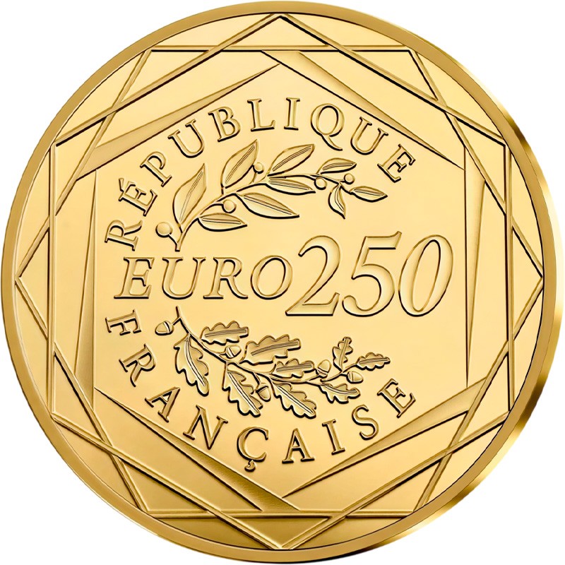 В центре указан номинал монеты - EURO 250, который обрамлен двумя ветвями — лавровой и дубовой. Лавр символизирует победу и славу, а дуб — силу и стойкость. Вся композиция вписана в три стилизованных гексагона. Это отсылка к географической форме Франции, которую часто называют «L'Hexagone». По кругу надпись - название страны-эмитента - RÉPUBLIQUE FRANÇAISE.