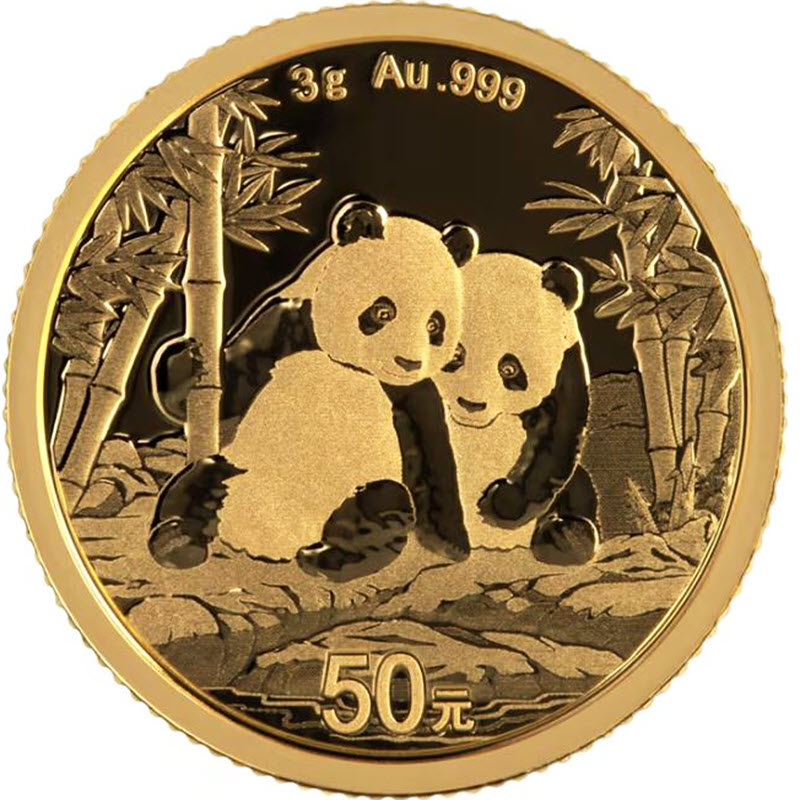 На реверсе изображены две панды на берегу ручья в бамбуковом лесу. Вверху надпись: 3 g Au.999 (вес и проба золота), внизу: 50 元 (номинал).