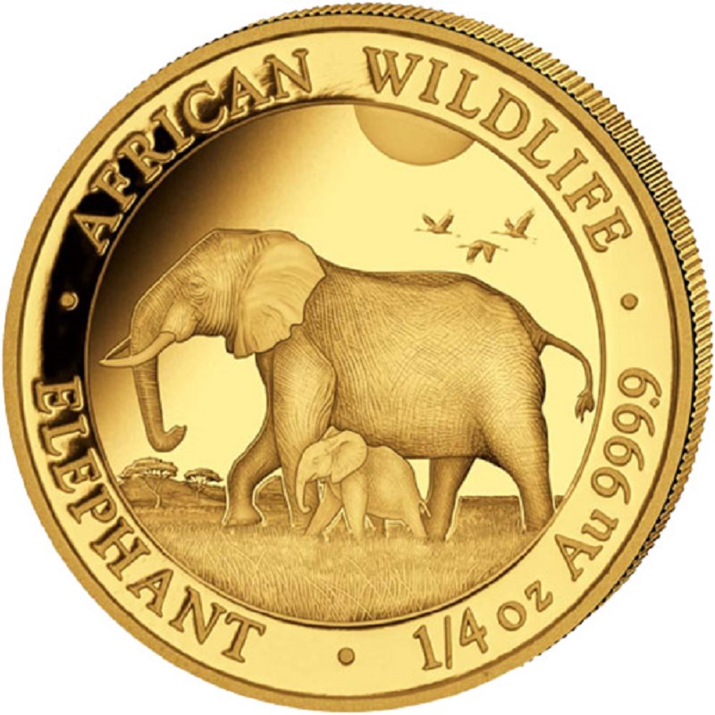 Золотая инвестиционная монета Сомали - Слон 2022 года выпуска весом 1/4 тройской унции (7.78 гр). Данная монета выпускается в рамках серии "Африканская дикая природа".