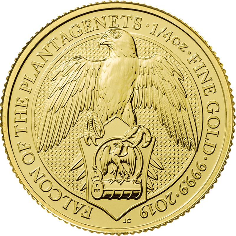 На реверсе изображение сокола, держащего в лапах щит. По кругу монеты - надписи на английской языке, обозначающие "Сокол Плантагенетов", 1/4 тройской унция чистого золота 999,9 пробы. Далее идет год выпуска монеты - 2019. Снизу, под изображением сокола, указаны инициалы дизайнера монеты - JC (Jody Clark).