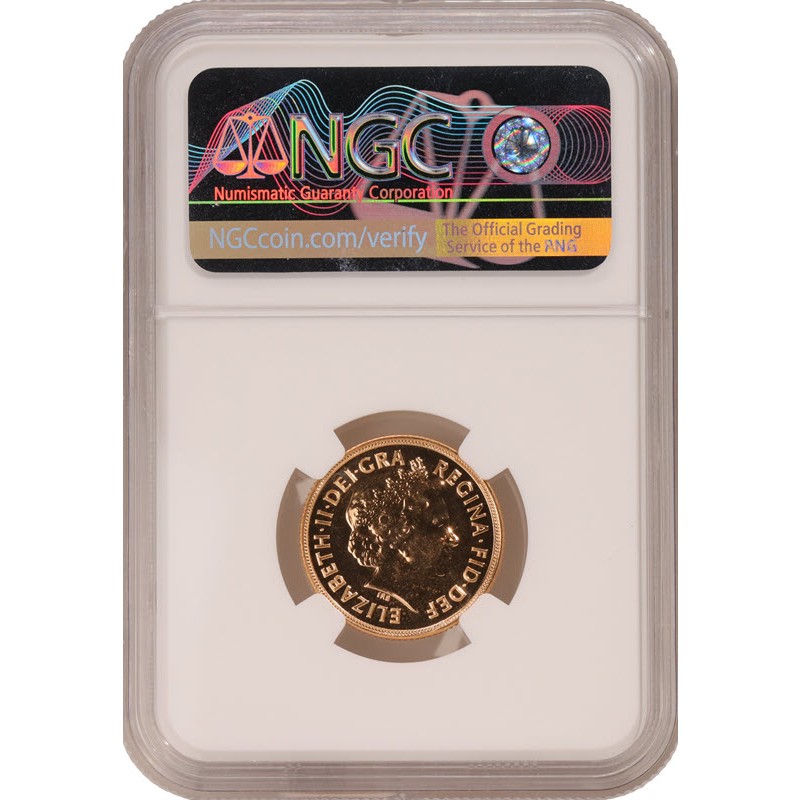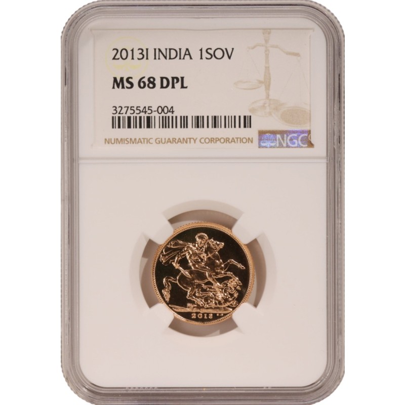 Золотая монета Великобритании "Соверен Елизавета II (1998-2015 - 4-й портрет)" (Индия) 2013 г.в. в слабе NGC MS68 DPL, 7.32 г чистого золота (проба 917)