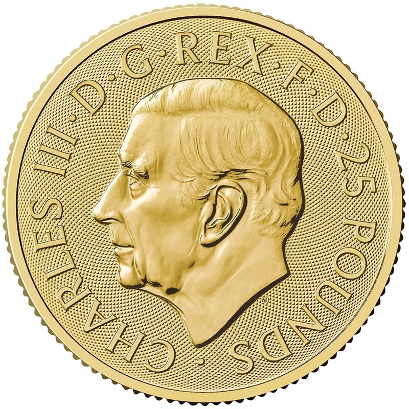 На аверсе изображен Его величество Король Чарльз III. Внизу портрета инициалы дизайнера MJ (Martin Jennings). Вокруг портрета надпись: CHARLES III · D · G · REX · F · D · 25 POUNDS · (Чарльз III, божьей милостью, король, защитник веры, номинал).