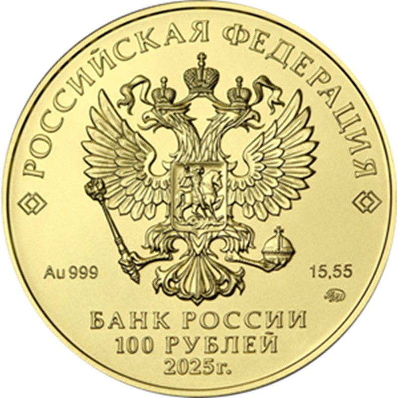 На аверсе в центре — рельефное изображение Государственного герба Российской Федерации, вверху вдоль канта надпись: РОССИЙСКАЯ ФЕДЕРАЦИЯ, обрамленная с обеих сторон сдвоенными ромбами, под гербом надпись: Au 999 15,55 ..МД (вес и проба золота, монограмма монетного двора), внизу надпись в три строки: БАНК РОССИИ 100 РУБЛЕЙ 2025 г. (банк, номинал, год чеканки).