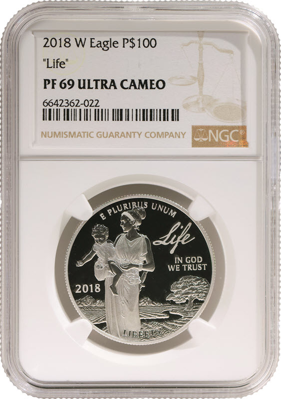 Эта прекрасная монета – первая из серии «Преамбула к Декларации независимости» - посвящена Жизни. У нее качество пруф. Поставляется в слабе. Тираж: 20000 штук.