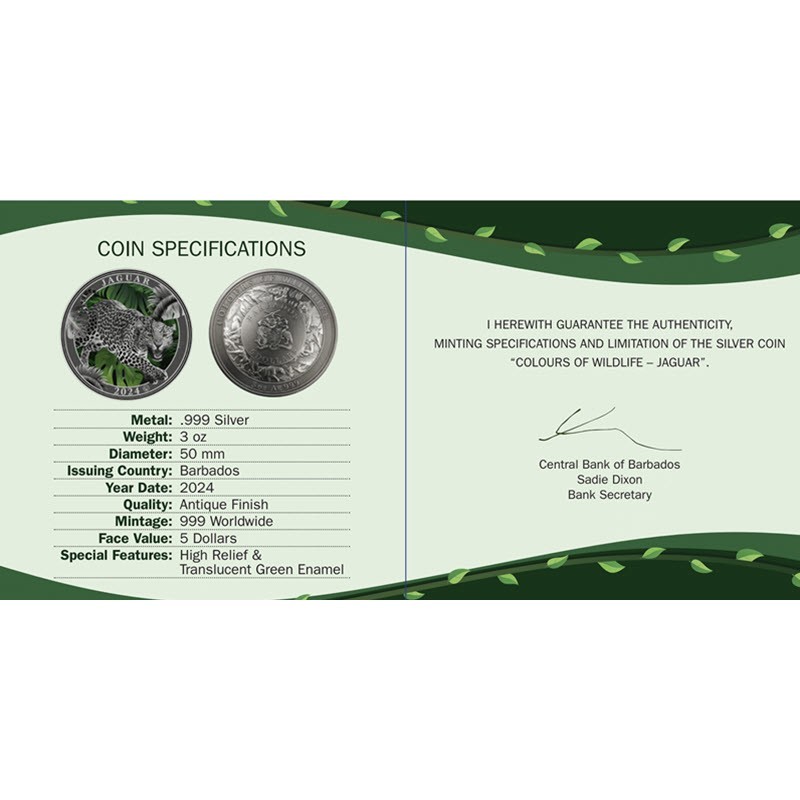 Серебряная монета Барбадоса "Цвета дикой природы. Ягуар" 2024 г.в., 93.3 г серебра (проба 999)
