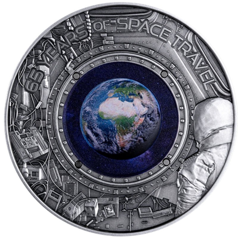 На реверсе верхней монеты изображен люк корабля в окружении аппаратуры, панелей и кабелей. Вверху надпись: 65 YEARS OF SPACE TRAVEL. При съеме магнитной крышки открывается вид на Землю из космоса. Вверху надпись: 65 YEARS OF SPACE TRAVEL.