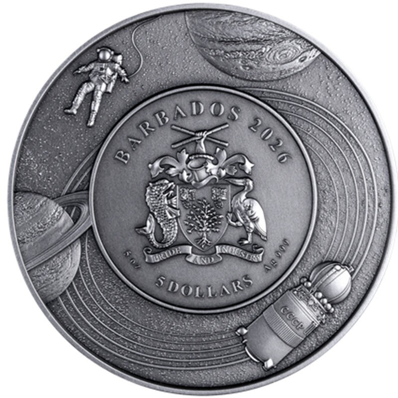 На аверсе изображен герб Барбадоса. Вокруг герба надпись: BARBADOS 2026 5 oz 5 DOLLARS Ag 999 (страна-эмитент, год чеканки, вес и проба серебра, номинал). Фоном служат планеты, космонавт и корабль на орбите.