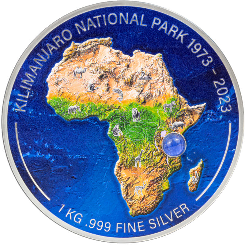 На реверсе изображена карта Африки с животными в разных странах, а потрясающий танзанит огранки кабошон диаметром 9 мм подчеркивает расположение Танзании. Африку окружает глубокое синее море цвета Chromonite Color. Вверху надпись: KILIMANJARO NATIONAL PARK 1973 – 2023, внизу: 1 KG .999 FINE SILVER (вес и проба серебра).