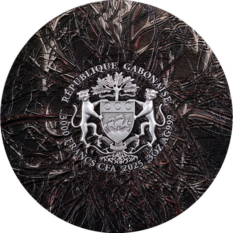 На аверсе монеты отчеканен герб Габона с изображением двух пантер, держащих щит. На щите парусник и три сферы под деревом окуме. На ленте девиз на латыни: Uniti progrediemur (Вместе мы пойдем вперед). Под щитом лента с французским национальным девизом: UNION TRAVAIL  JUSTICE (Союз, Труд, Справедливость). Вокруг герба надпись: RÉPUBLIQUE GABONAISE 3000 FRANCS CFA 2025 3 OZ AG999 (страна-эмитент, номинал, год чеканки, вес и проба серебра). Фоном служит розовый куст, полный шипов.