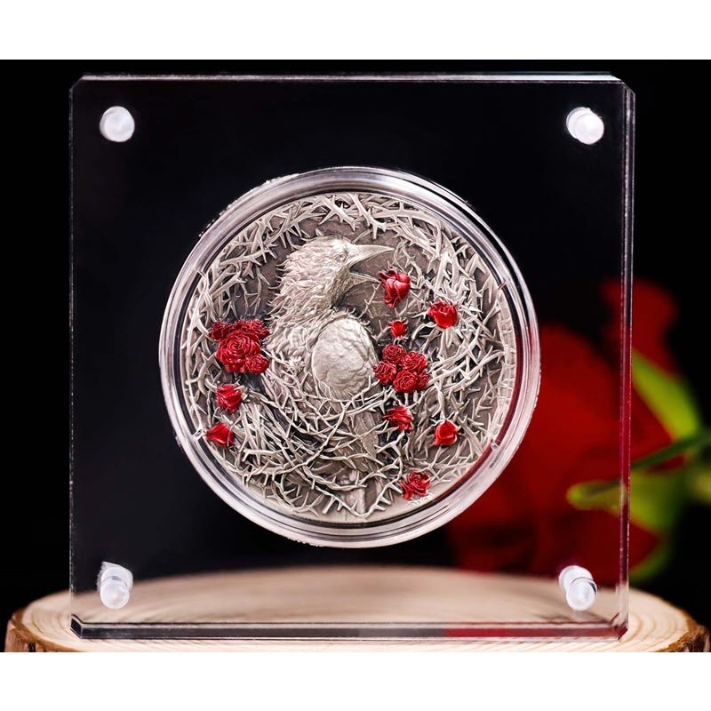 Эта чудесная серебряная монета весом в 3 унции посвящена Большой Терновой Птице - символ стойкости и триумфа перед лицом невзгод. Монета служит одой преодолению препятствий, призывая людей мужественно преодолевать трудности. Это эмоциональный пробный камень, призывающий вас преодолевать трудности каждого дня стойко и мужественно. Каждая встреченная колючка становится нотой в симфонии вашего путешествия, а каждое преодоленное препятствие — крещендо триумфа. Красный цветок - устойчивое цветение среди хаоса. Красный цветок олицетворяет неукротимый дух внутри каждого из нас, который преодолевает трудности, процветает вопреки всему и излучает яркий свет даже в самые мрачные моменты. Монета имеет античную отделку, шикарный дизайн и выборочную окраску. Поставляется в футляре с сертификатом подлинности. Тираж: 333 штуки.