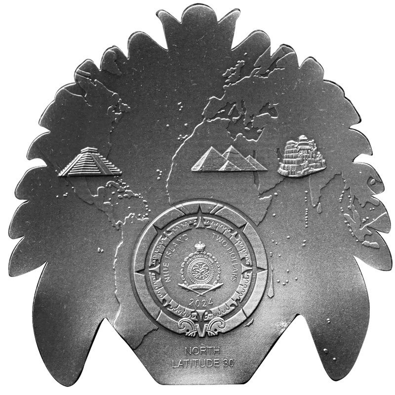 На аверсе монеты изображены контуры континентов и археологические памятники. Внизу неофициальная «Государственная печать Ниуэ». Это  композиция из растений в центре внутри двойного декоративного круга, окруженного морскими раковинами. Он увенчан короной Святого Эдуарда (символом Соединенного Королевства, монарх которого в конечном итоге является главой государства Ниуэ). Сверху между ними надпись PUBLIC SEAL OF NIUE. Ниже на ленте в две строки изображен девиз ATUA NIUE TUKULAGI, ниже которых две перекрещенные катуа. Вокруг герба надпись: NIUE ISLAND TWO DOLLARS 2024 (страна-эмитент, номинал, год чеканки). Ниже: NORTH LATITUDE 30 (координаты памятника).