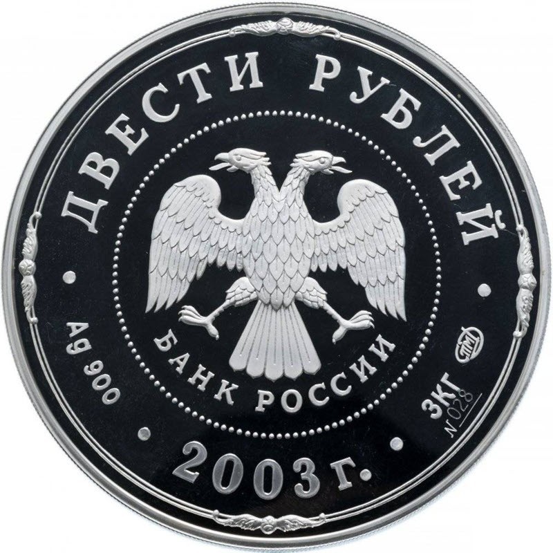 На аверсе в центре эмблема Банка России (двуглавый орел c опущенными крыльями, под ним надпись полукругом: БАНК РОССИИ). Вдоль канта надпись: ДВЕСТИ РУБЛЕЙ • Ag 900 • 2003 г. • 3 КГ №  СПМД • (номинал, год чеканки, вес и проба серебра, индивидуальный номер монеты, монограмма монетного двора).