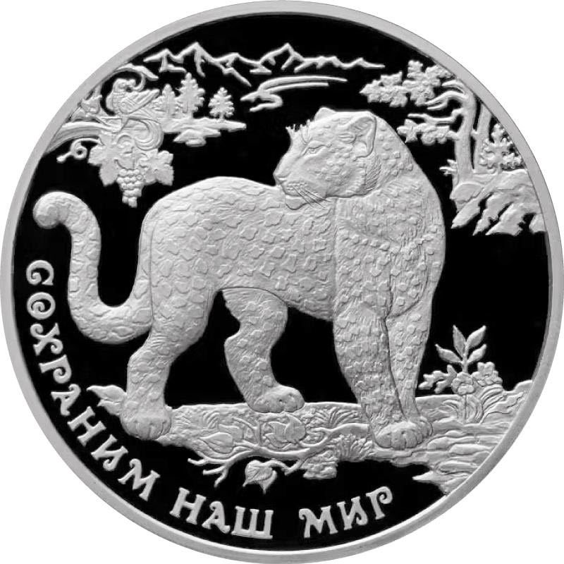 В центре диска - фигура стоящего, настороженно оглядывающегося леопарда, на втором плане слева и справа - отдельно стоящие деревья, за ними - контурные очертания далеких гор, внизу у канта - надпись полукругом: "СОХРАНИМ НАШ МИР".