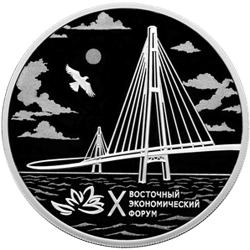 На реверсе изображен вантовый мост на о. Русский на фоне облаков и волн. Внизу логотип форума и надпись: Х ВОСТОЧНЫЙ ЭКОНОМИЧЕСКИЙ ФОРУМ.
