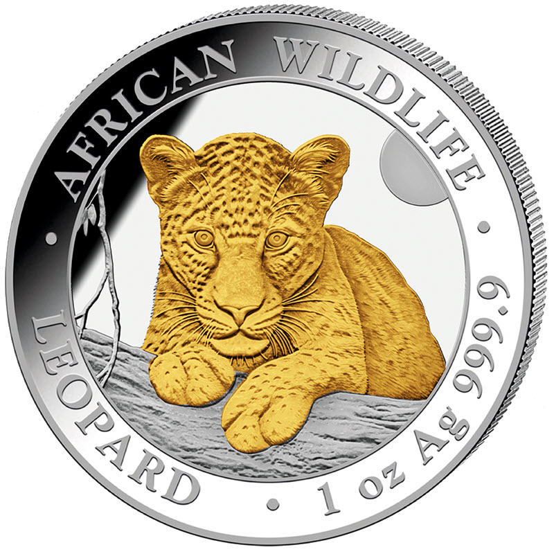 Серебряная монета Сомали - Леопард 2025 года (восьмой выпуск) из серии "Африканская дикая природа". У нее качество BU и выборочное золочение. Поставляется в капсуле. Тираж: 5 000 штук.