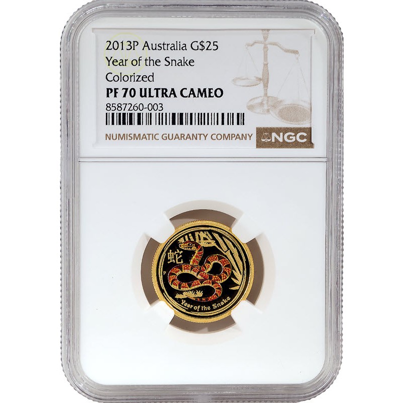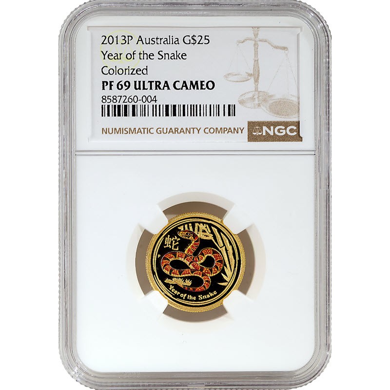 Золотая монета Австралии "Год Змеи" 2013 г.в. (пруф с цветом) в слабе NGC PF69 (PF70), 7.78 г чистого золота (проба 9999)