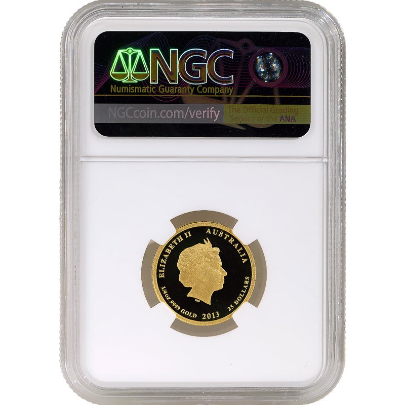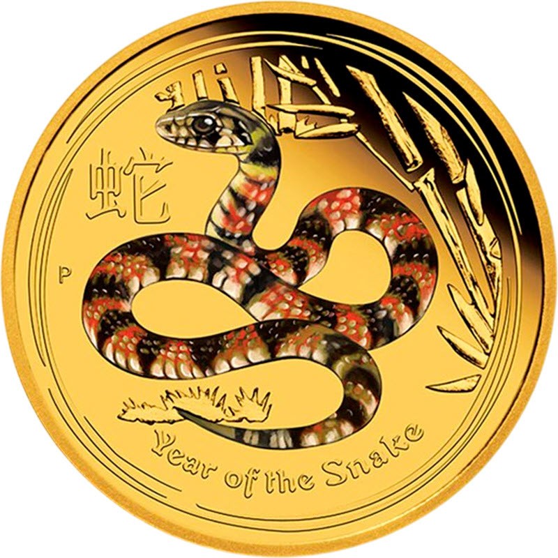 Золотая монета весом 1/4 унции из серии "Лунный календарь-II" - год Змеи - выпущена Пертским монетным двором в 2013 году. У нее качество пруф и селективная окраска. Поставляется в слабе. Тираж: 1210 штук.