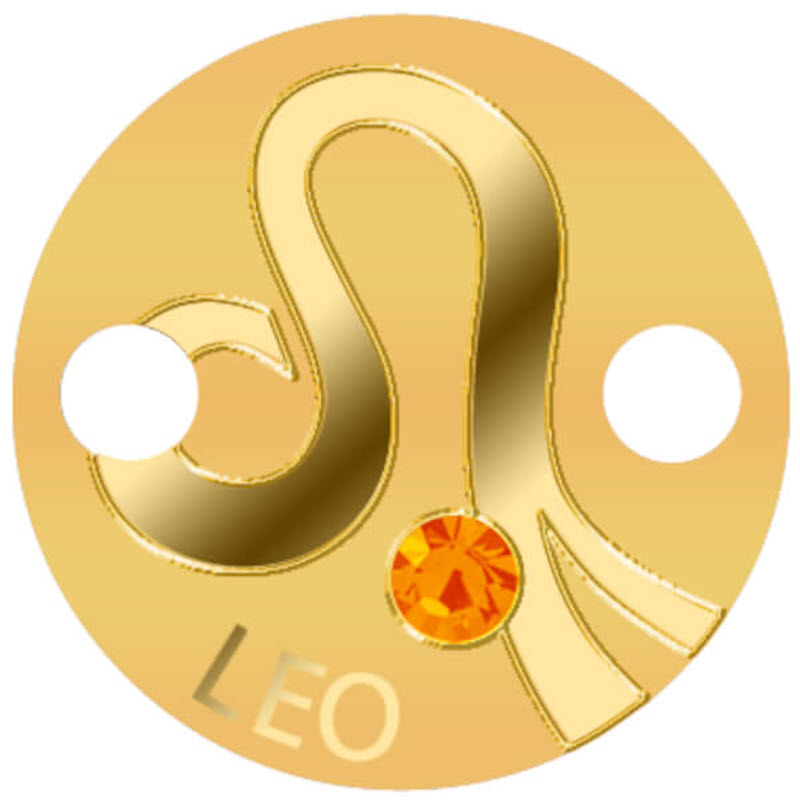 В центре стилизованный астрологический символ Льва. Внизу золотой кристалл Сваровски, надпись: LEO (ЛЕВ).