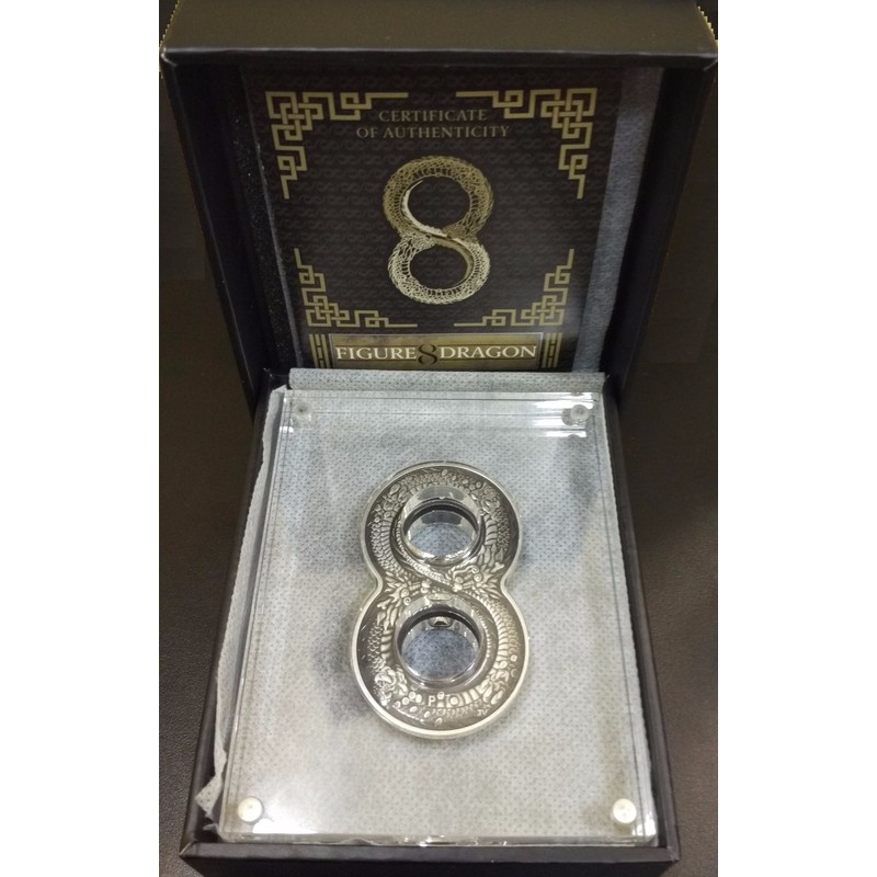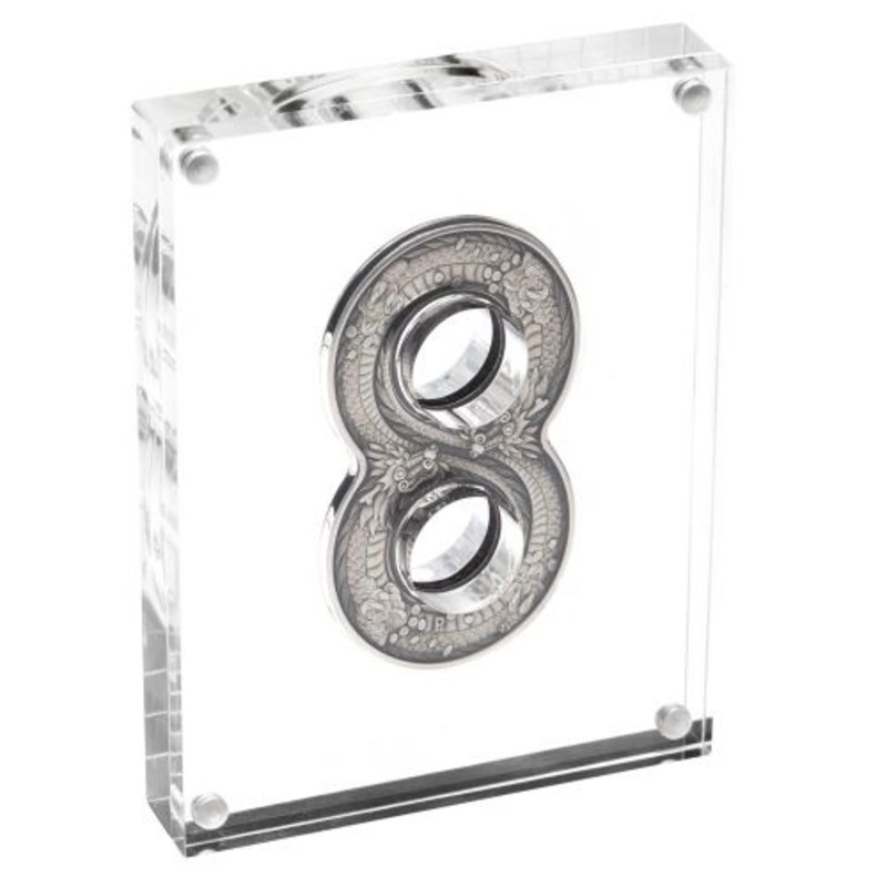 Монетный двор Perth Mint выпустил монету в форме восьмерки с изображением двух драконов переплетенных между собой и держащие монеты в когтях. Монете искусственно состарена, что придает ей уникальную отделку и вид древнего артефакта.