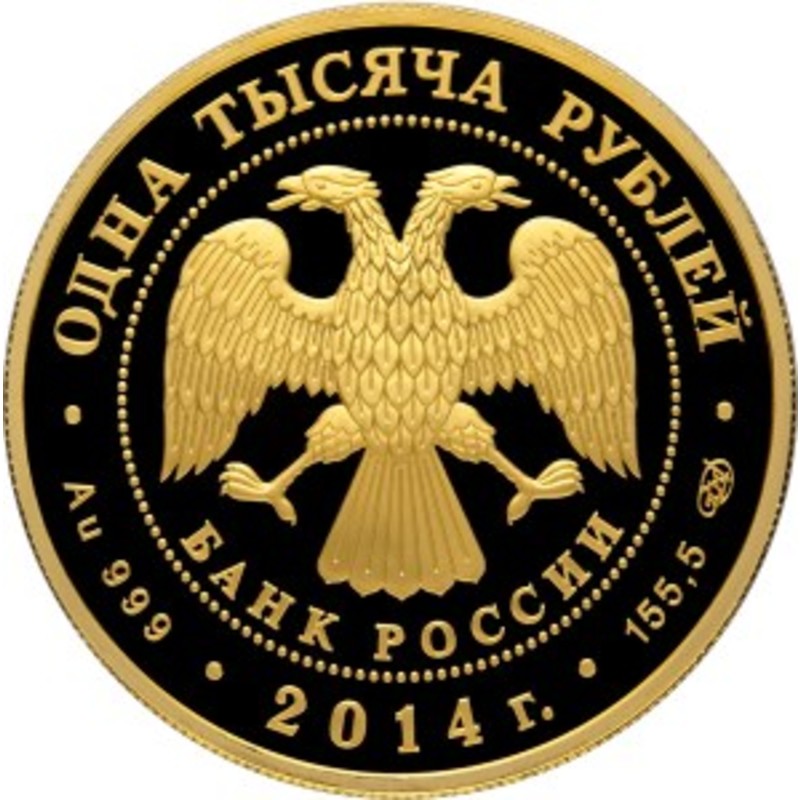 В центре – эмблема Банка России (двуглавый орёл с опущенными крыльями, под ним – надпись полукругом "БАНК РОССИИ"), обрамленная кругом из точек и надписями по кругу – вверху: "ОДНА ТЫСЯЧА РУБЛЕЙ", внизу: слева – обозначения драгоценного металла и пробы сплава, в центре – дата выпуска "2014 г.", справа – содержание химически чистого металла и товарный знак монетного двора.