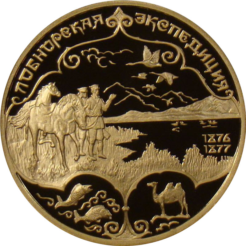 Изображение участников экспедиции на берегу озера, справа — даты в две строки «1876 » «1877», внизу слева — плавающие рыбы, справа — дикий верблюд. Вверху — птицы и надпись по окружности: «ЛОБНОРСКАЯ ЭКСПЕДИЦИЯ».