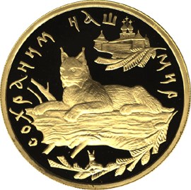 В центре диска - изображение лежащей на стволе дерева рыси, вверху - древнерусский город, внизу - белка, сидящая на еловой ветке, вверху по окружности - надпись: "СОХРАНИМ НАШ МИР".