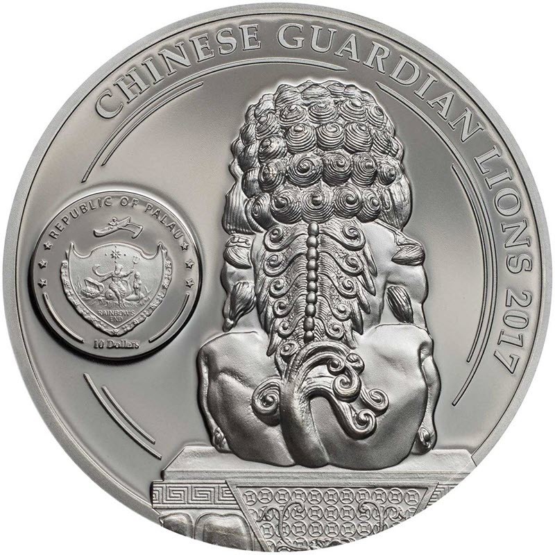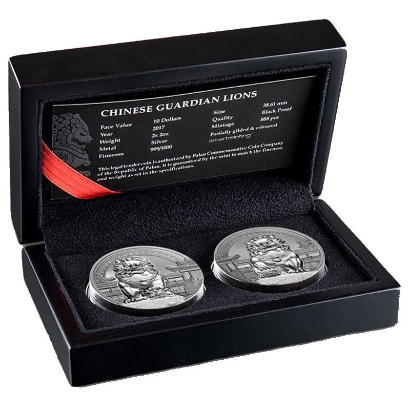 Набор Палау 2017 года посвящен китайским стражам-львам. У них качество черный пруф, селективная окраска и выборочное золочение. Поставляется в оригинальном футляре с сертификатом качества. Тираж: 888 штук.