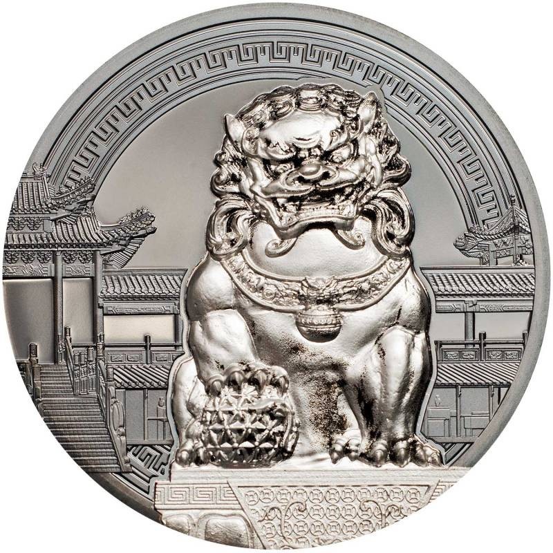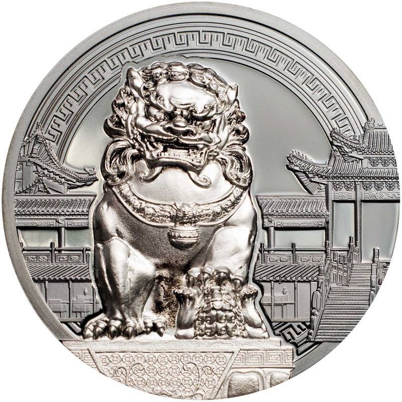 На реверсе каждой монете изображён один из львов с лапой на шаре, образуя зеркальное отражение друг друга. Фоном служит изображение китайской архитектуры.