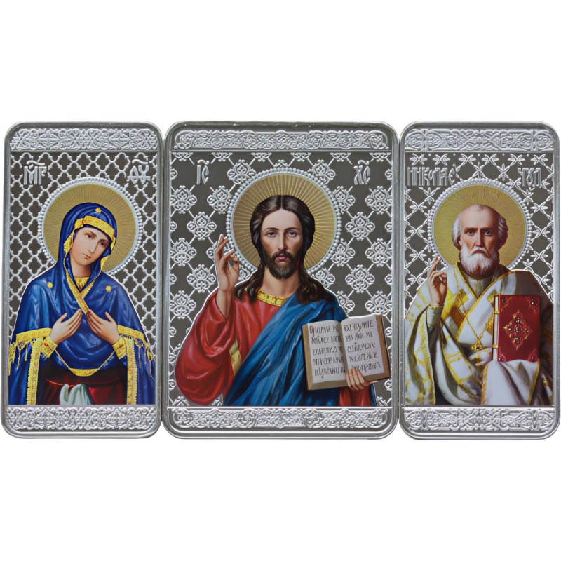 Этот чудесный набор из 3-х прямоугольных серебряных монет посвящен трем важнейшим православным святым: Иисусу Христу, Святому Николаю Чудотворцу, Богородице.