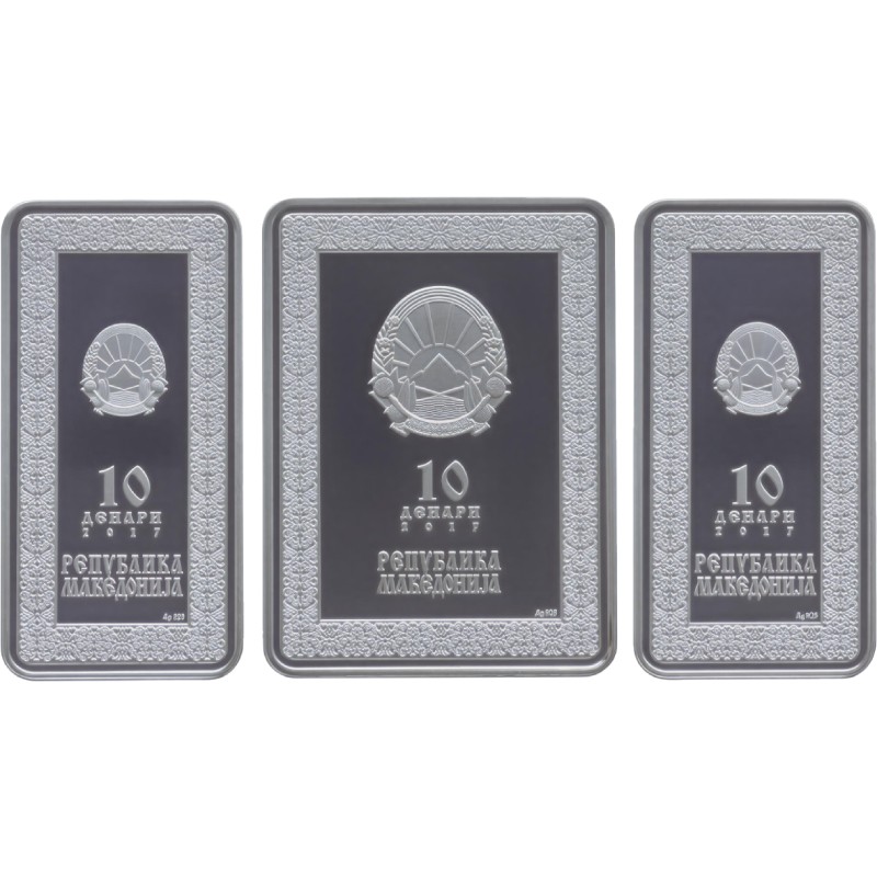 На аверсе каждой монеты в центре - герб Республики Македония, под ним надписи: 10 денари 2017 Република Македонија (номинал, год чеканки, страна-эмитент). Внизу слева – Ag 925 (проба серебра). Монета вдоль канта украшена орнаментом.