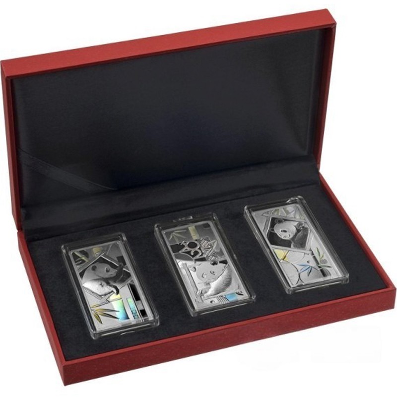 Этот удивительный набор из трех серебряных жетонов прямоугольной формы весом 20 г каждый посвящен Пандe, одному из самых любимых национальных символов Китая. Каждый жетон дополнен завораживающим голографическим эффектом. Переливающийся разными цветами он придает сверкающий цвет и глубину изображению.