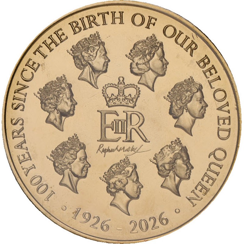 На реверсе монет уникальные портреты королевы Елизаветы II работы Рафаэля Маклауфа (Raphael David Maklouf), ранее не публиковавшиеся, охватывающие семь десятилетий её правления. Вдоль канта надпись: 100 YEARS SINCE THE BIRTH OF OUR BELOVED QUEEN · 1926 - 2026 ·.
