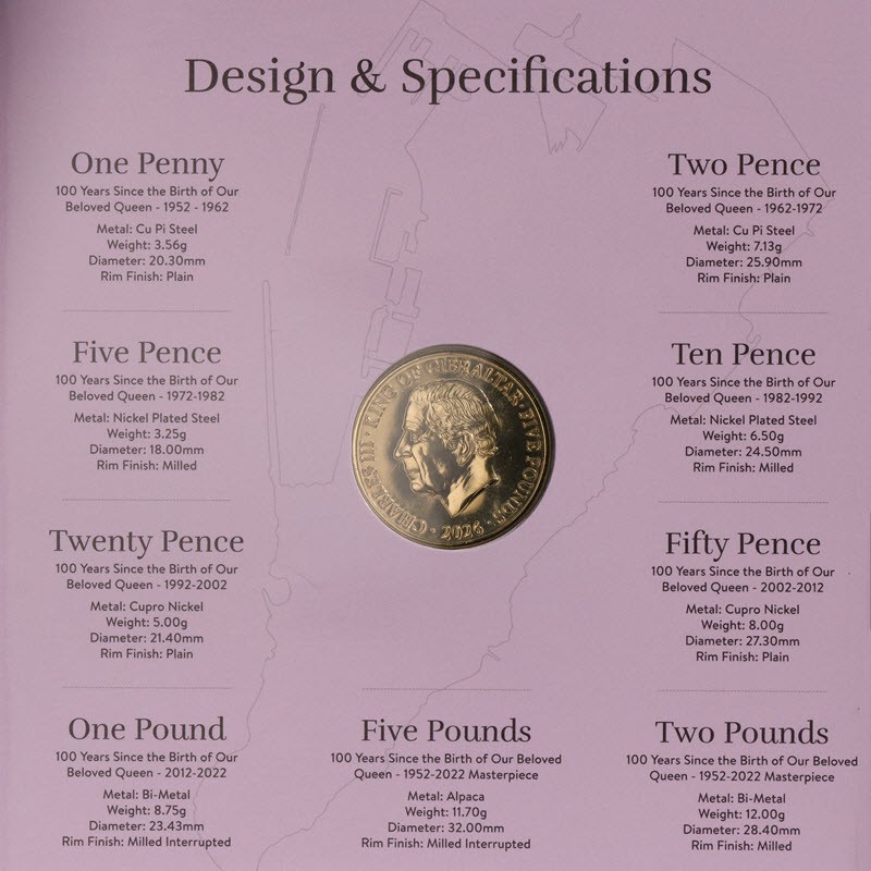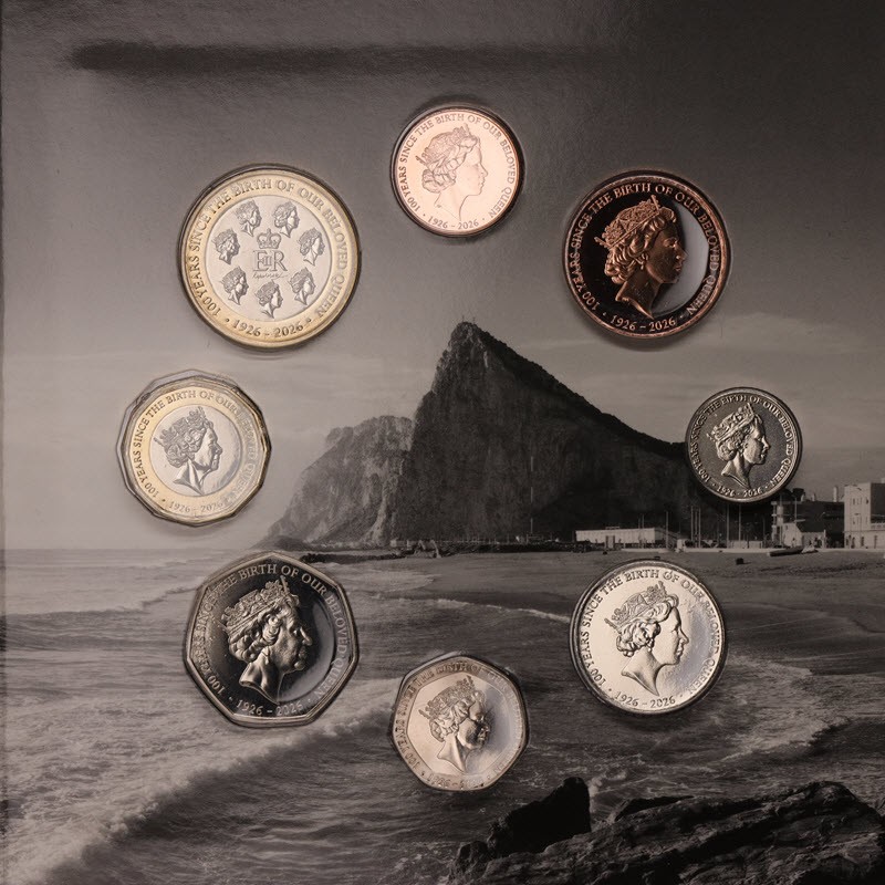 Набор монет Гибралтара в честь 100-летия королевы Елизаветы II от монетного двора Tower Mint. Каждое изображение представляет собой отдельное десятилетие рекордного правления королевы Елизаветы II, дизайн реверса является центральным элементом коллекции, объединяя историю и нумизматическое наследие.