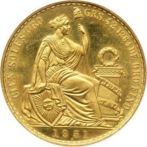 Золотая монета Перу «100 солей» с изображением сидящей Свободы, держащей щит, на котором помещен «Sol de Mayo» (Солнце Мая) – символ южно-американской независимости.