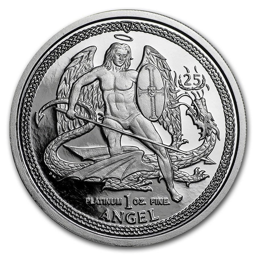 На реверсе помещен образ Архангела Михаила, убивающего дракона. Внизу обозначение содержание чистого металла в монете («AG. 999. 1 OUNCE» - 1 унция чистого серебра 0.999 пробы) и ее названия («ANGEL» - ангел). Вверху над драконом цифра «25», обозначающая 25-летний юбилей платиновой монеты.