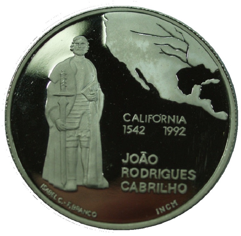 Жуан Родригес Кабрильо, первый европеец, совершивший навигацию по побережью современной Калифорнии, стоит перед картой Калифорнии. Надписи: ALIFÓRNIA
