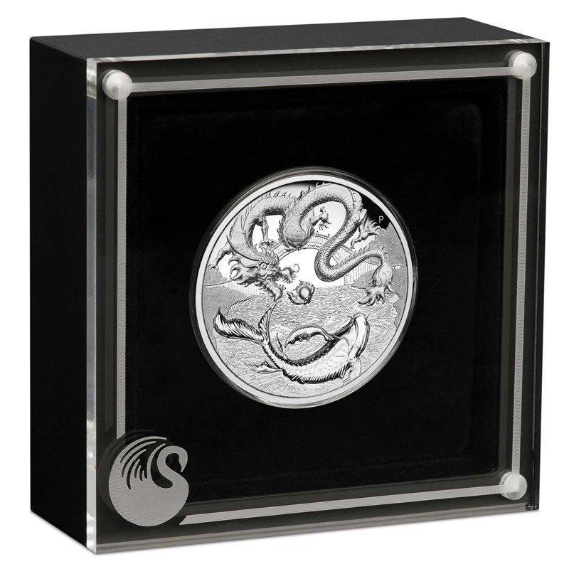 Серебряная монета из серии "Китайские мифы и легенды" от Пертского монетного двора Австралии весом в 1 тройскую унцию посвящена Дракону и Кои.