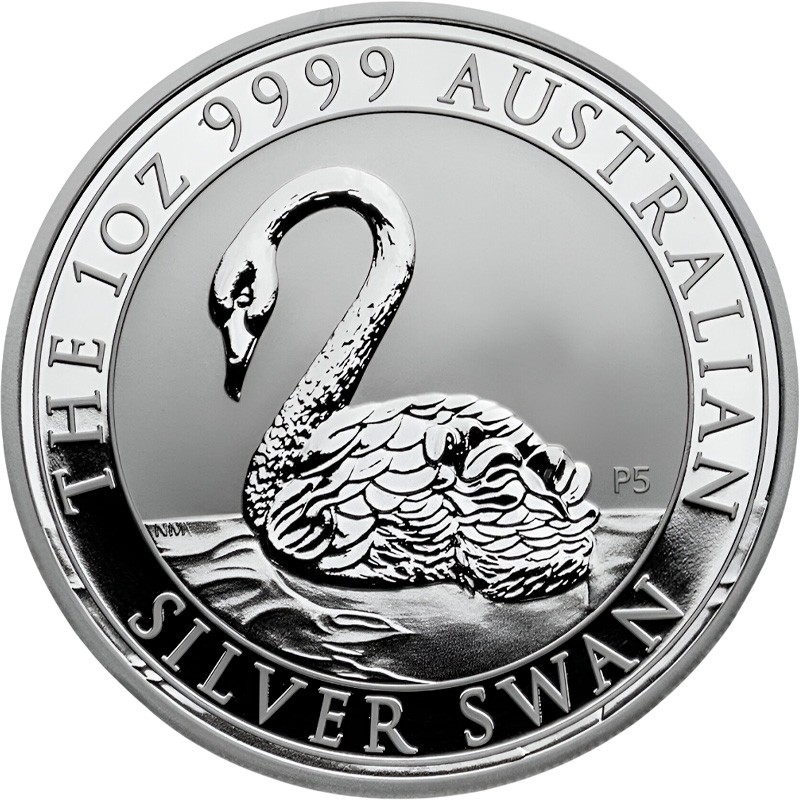 На реверсе изображен лебедь, плывущий по воде. Слева от лебедя инициалы дизайнера NM (Natasha Muhl). Справа монограмма Пертского монетного двора P5 -  пятилетие серии «Австралийский лебедь». Вдоль канта надпись: THE 1oz 9999 AUSTRALIAN SILVER SWAN (вес и проба серебра, серия).